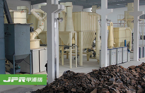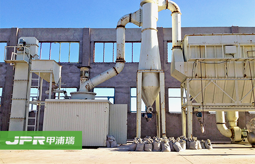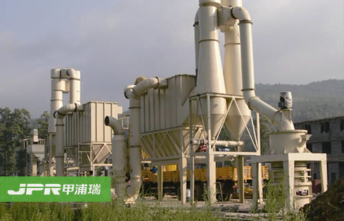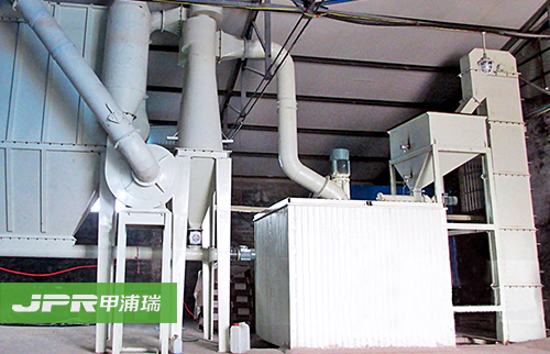 物料經顎式破碎機破碎后,由斗式提升機送至儲料倉,通過電磁振動給料機把物料均勻連續(xù)地送到主機進行研磨,研磨后的粉末在鼓風機的作用下吹向選粉機進行分 選,分選后的細粉由管道送至儲料倉,后經出料閥輸出即為成品。整套生產線工作過程中氣壓為負,首先鼓風機吹出的空氣伴隨著細粉經管道進入儲料倉上部的旋 風收集器內,由回風管道返回鼓風機,形成空氣循環(huán)利用。其次,集粉器下端裝有鎖粉器,其作用是將外界正壓氣體與集粉器負壓氣體隔離開,大大提高了產量。再 次,主機底部殘留的空氣和粉塵通過管道被送到布袋除塵器進行過濾,粉塵等雜質被布袋除塵器吸附,有效地保護了環(huán)境。